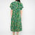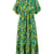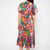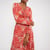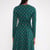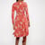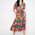 Ein tiefer V-Ausschnitt und ein figurbetontes Oberteil mit langen Glockenärmeln gehen sanft in einen fließenden, mittellangen Rock über – dieser verleiht diesem Kleid eine damenhafte Form und bleibt gleichzeitig fröhlich und hip.