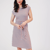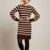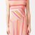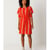 A-förmiges Kleid mit kurzen Kimonoärmeln und Bindegürtel. Endet oberhalb des Knies und hat einen Rundhalsausschnitt. Mit roten Streifen.